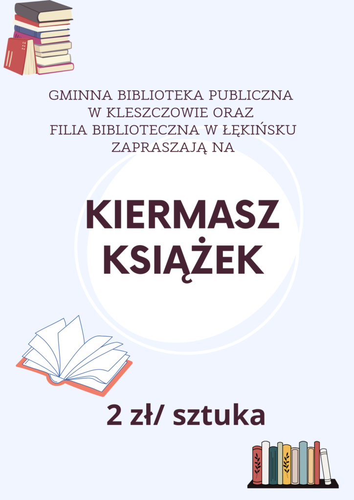 Kiermasz książek! Gminna Biblioteka Publiczna w Kleszczowie oraz Filia Biblioteczna w Łękińsku zapraszają na KIERMASZ KSIĄŻEK w godzinach pracy bibliotek. 2zł/ sztuka