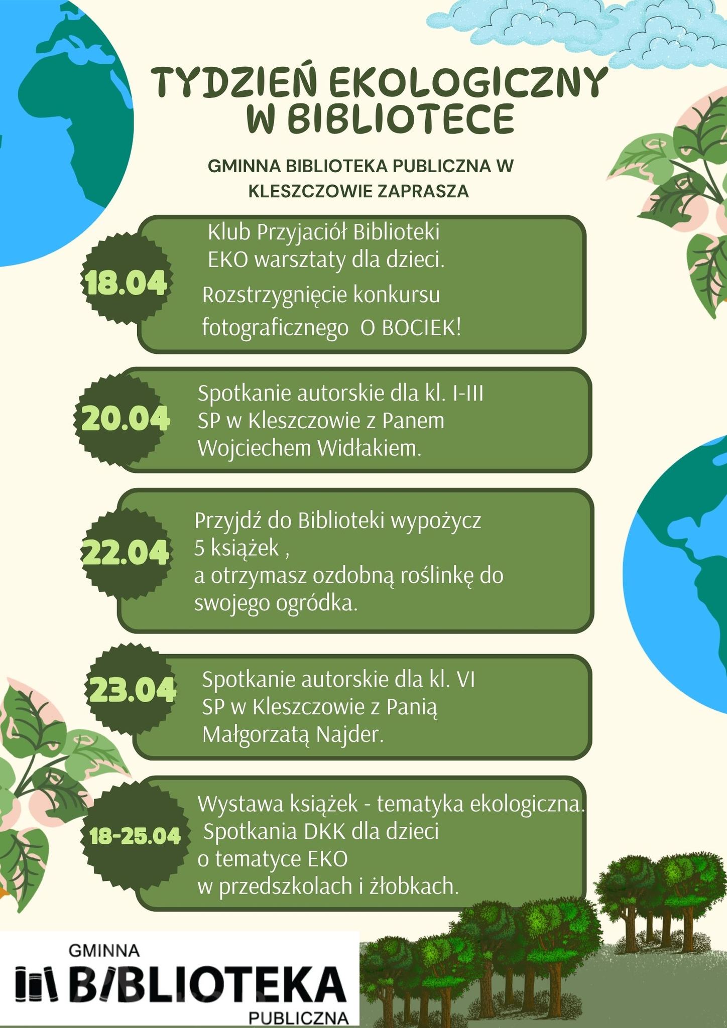 Zapraszamy Was na wyjątkowy tydzień pełen zielonych inspiracji. W najbliższych dniach nasza biblioteka zamieni się w centrum ekologicznych działań!